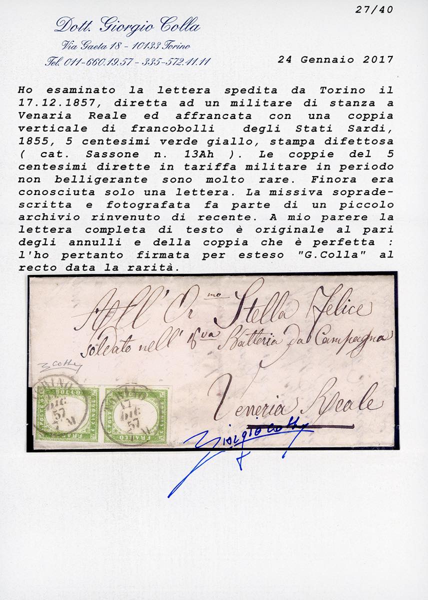 1857 - 5 cent. verde giallo, stampa difettosa (13Ah), coppia perfetta, su fresca lettera, in TARIFFA RIDOTTA PER MILITARI, da Torino 17/12/1857 a Venaria Reale. Rarissime le lettere con la coppia isolata in tariffa ridotta durante il periodo non belligerante. Si tratta dell'UNICA LETTERA NOTA CON QUESTA PREGEVOLE TINTA. Rarità! Ferrario. Cert. Colla (stima cat. Sassone € 50.000).