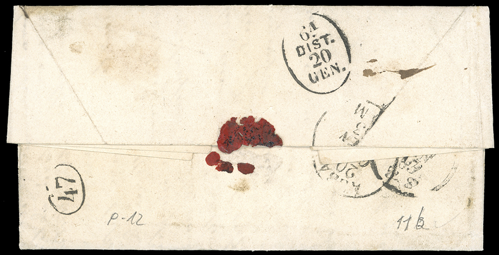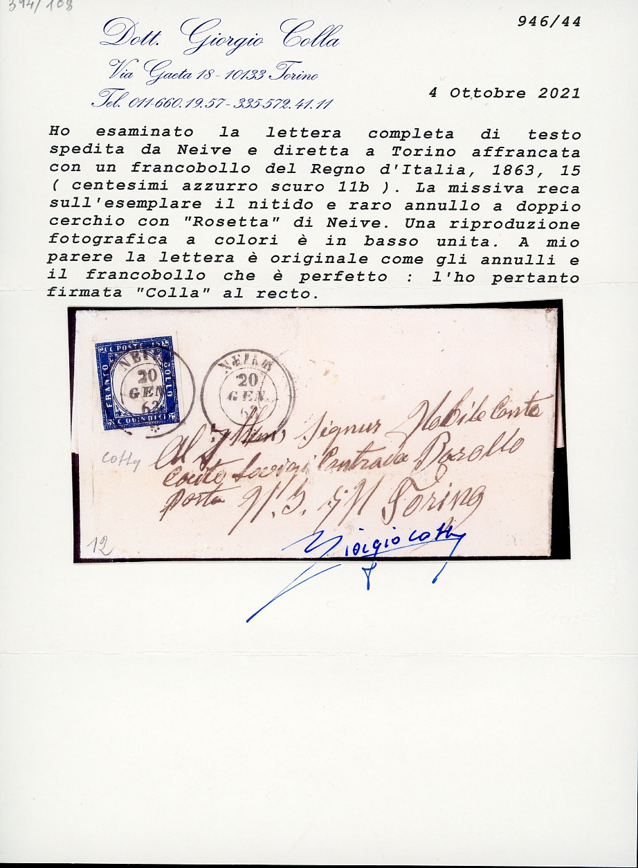 PIEMONTE-NEIVE, punti 12 - 15 cent. (11b), perfetto, su lettera del 20/1/1863 per Torino. Pregevole annullo. Cert. Colla.