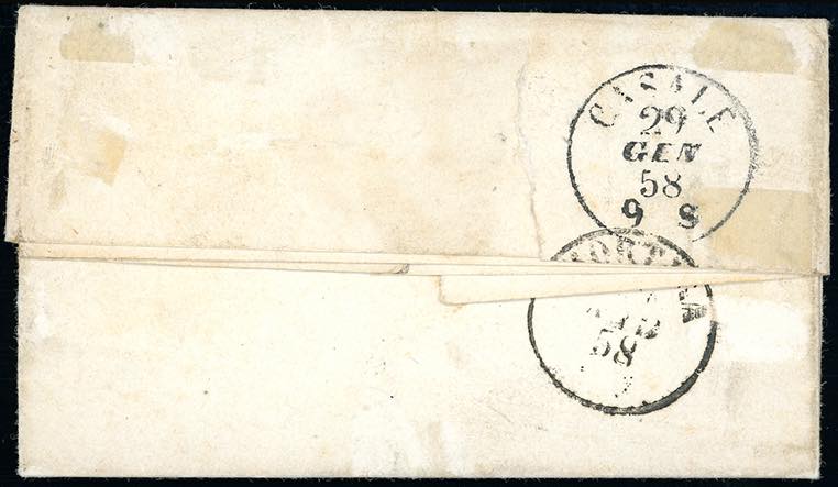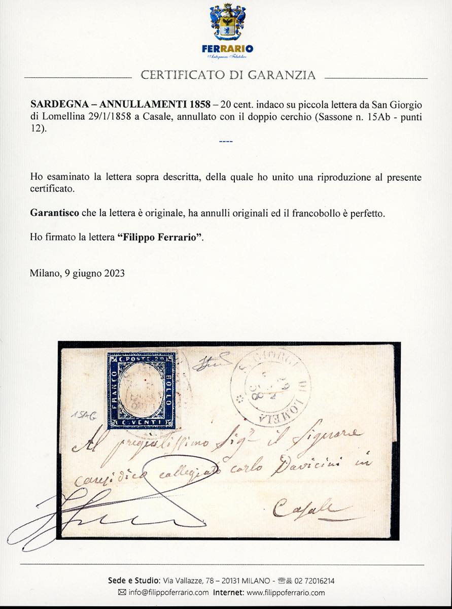 PIEMONTE-SAN GIORGIO DI LOMELLINA, punti 12 - 20 cent. (15Ab), perfetto, su piccola lettera del 29/1/1858 per Casale. Non comune. Cert. Ferrario.
