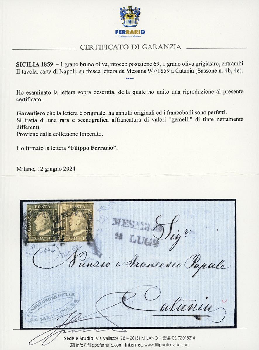 1859 - 1 grano bruno oliva, ritocco posizione 69, 1 grano oliva grigiastro, a filo in alto, entrambi II tavola, carta di Napoli (4b,4e), su fresca lettera da Messina 9/7/1859 a Catania. Rara e scenografica affrancatura di valori "gemelli" di tinte nettamente differenti. Chiavarello, Enzo Diena, cert. Ferrario. Ex coll. Imperato.