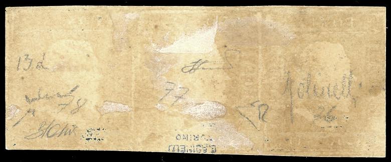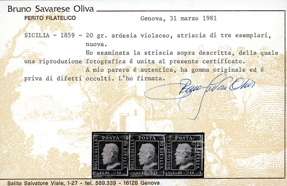 1859 - 20 grana ardesia violaceo (13d), striscia orizzontale di tre, posizioni 76, 77, 78 del foglio, nuova, gomma originale, leggera traccia di linguella, perfetta. Molto bella. Chiavarello, Golinelli, E.Diena, cert. Oliva e Ferrario. Ex coll. Imperato.
