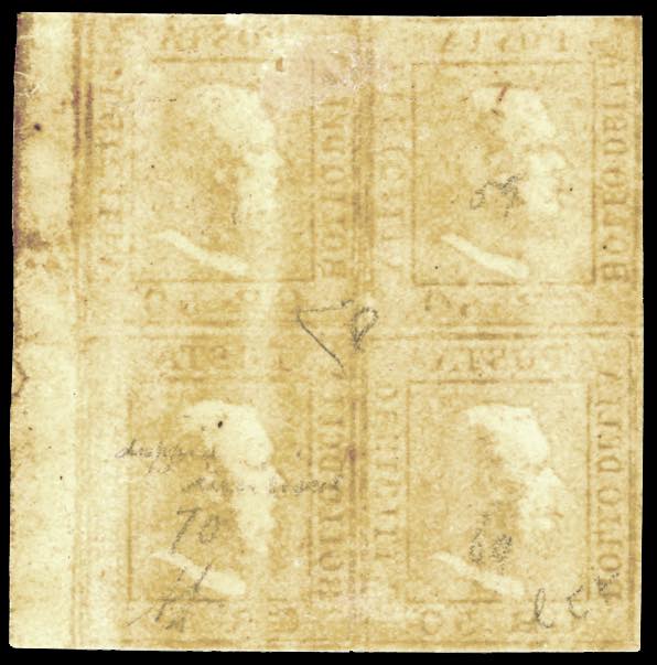 1859 - 50 grana lacca bruno (14), blocco di quattro,pos. 59-60, 69-70, bordo di foglio, testa d'avorio al verso, gomma originale, perfetto ... Leggi tutto