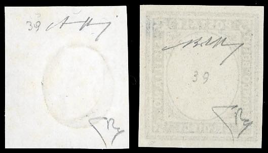 SAGGI 1860 - 10 cent. saggio Ficarotta, un esemplare senza effigie e uno con effigie (P64,P67), nuovi, senza gomma come sempre, perfetti. Rari. E.Diena, A.Bolaffi, cert. finanziario Bolaffi 75%.
