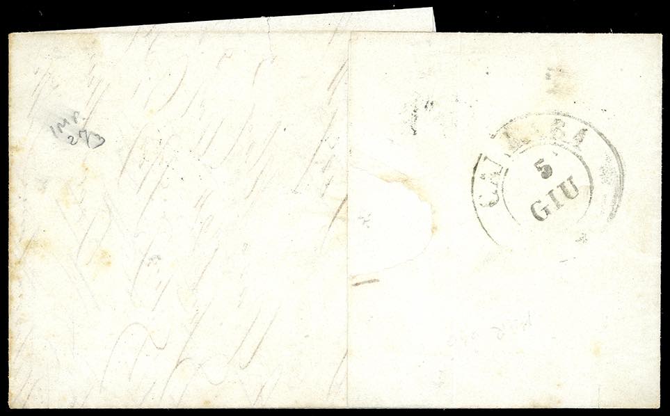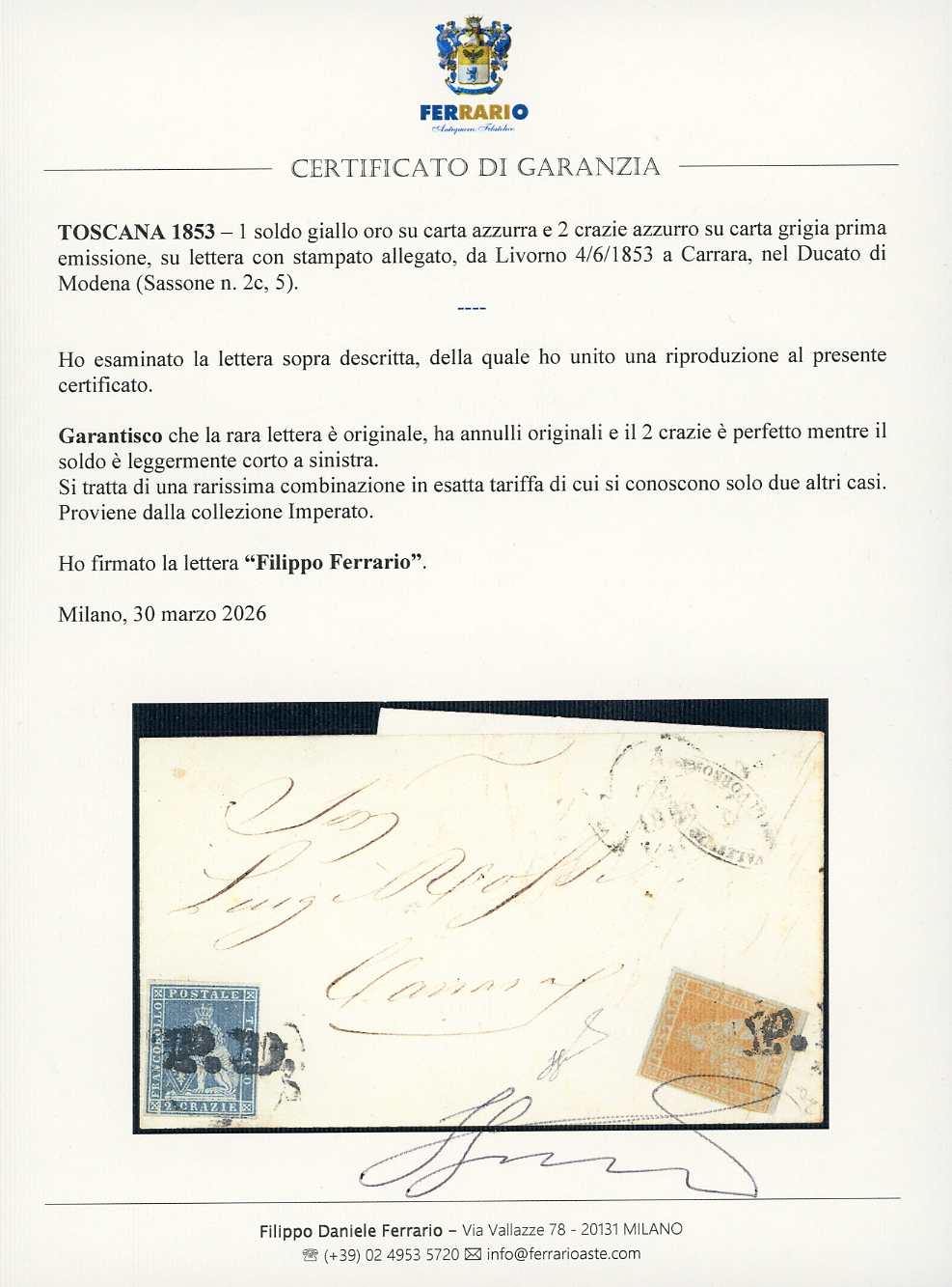 1853 - 1 soldo giallo oro su carta azzurra e 2 crazie azzurro su carta grigia (2c,5), su lettera con stampato allegato, da Livorno 4/6/1853 a Carrara, nel Ducato di Modena. Rarissima combinazione di cui si conoscono solo due altri casi. E.Diena, cert. Ferrario. Ex coll. Imperato.