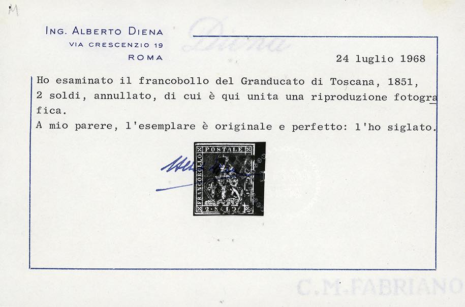 Lotto 655 - 1851 - 2 soldi scarlatto su azzurro (3), perfetto, con tre ...