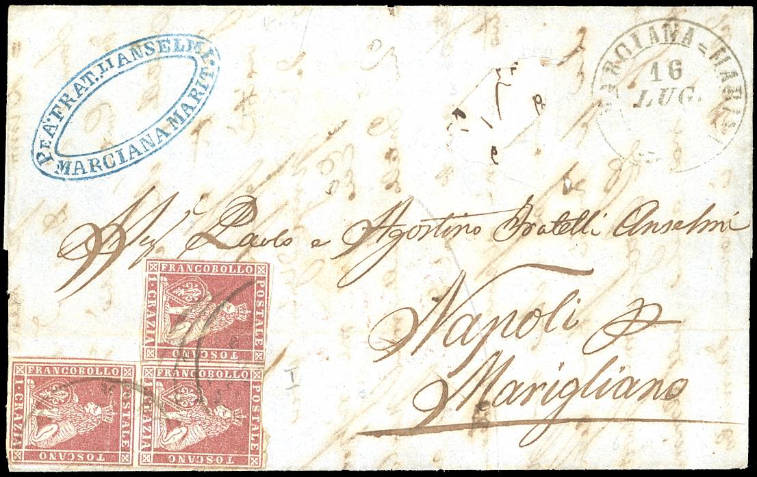 1856 - 1 crazia carminio chiaro su grigio (4), striscia di tre a seggiola, difetti di marginatura, su lettera da Marciana Marina 16/7/1856 a Marigliano, al verso bollo di transito per lo Stato Pontificio, via di terra. Interessante.