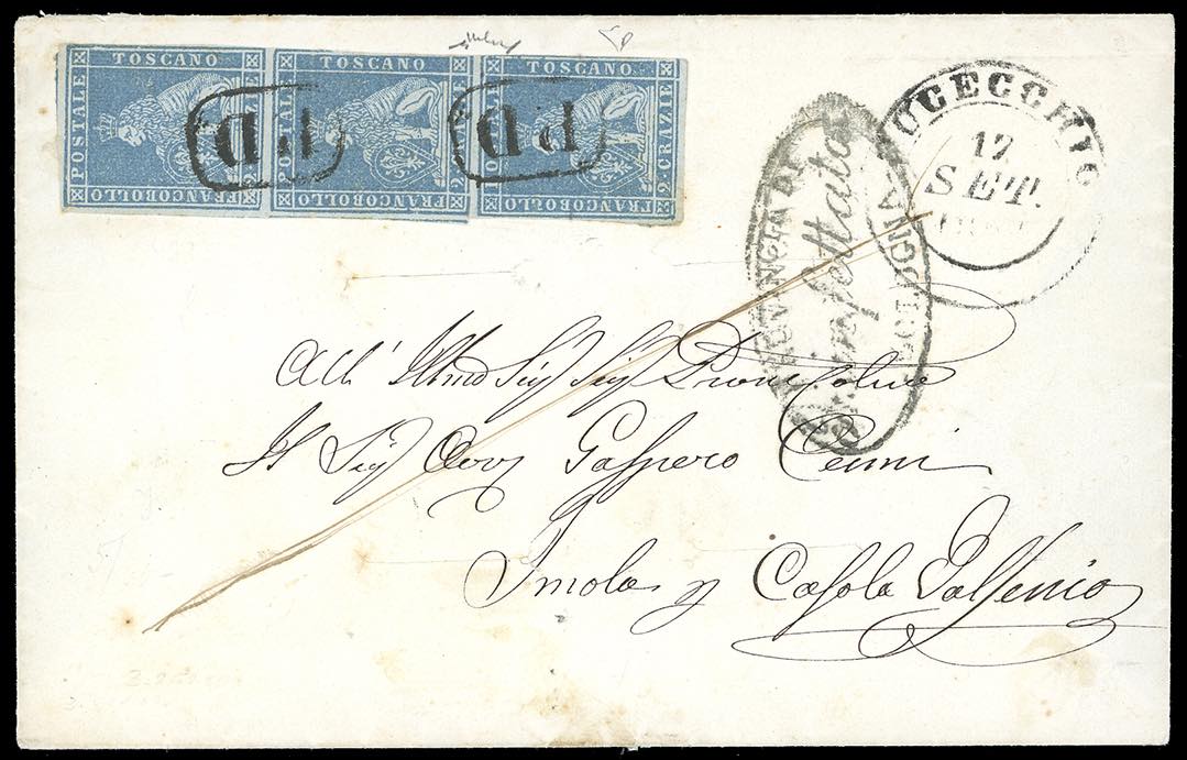 1851 - 2 crazie azzurro su grigio (5), striscia verticale di 3, difetti di marginatura su fresca lettera da Fucecchio 17/9 a Casola Valsenio, tagli di disinfezione e bollo ovale "Disinfettata Provincia di Bologna". E.Diena, Chiavarello.