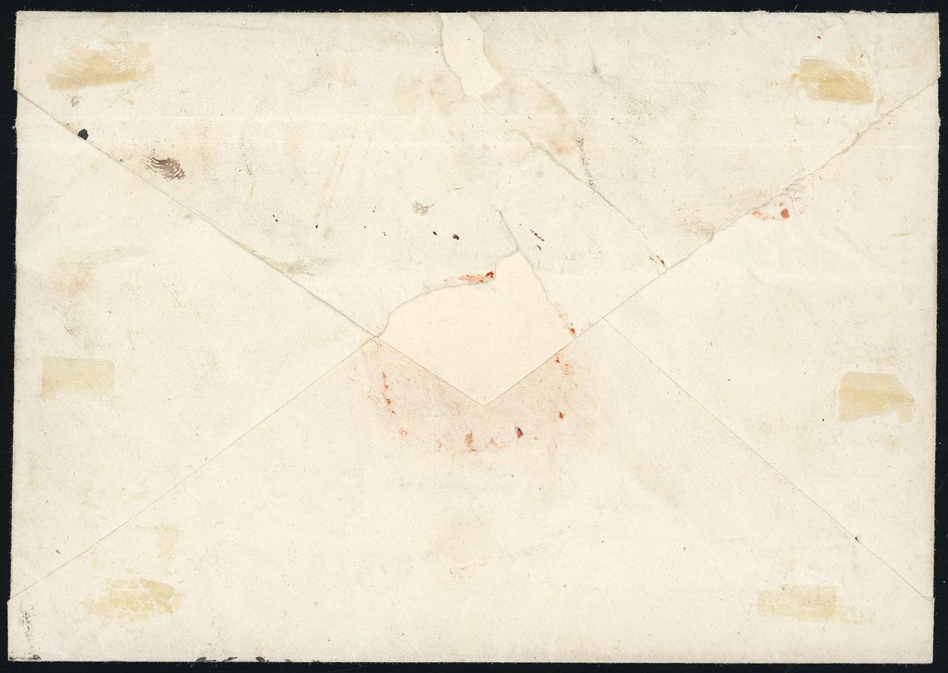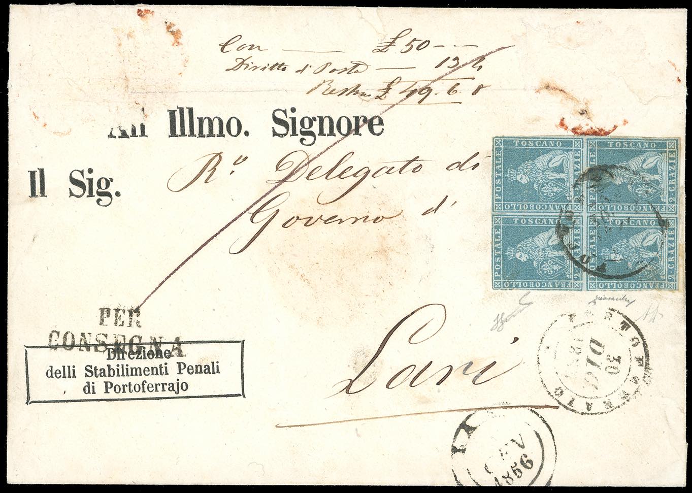 1855 - 2 crazie azzurro chiaro su grigio (5), blocco di quattro, lievi difetti di marginatura, su busta assicurata valore, lineare "per consegna" su due righe, dalla Direzione degli Stabilimenti Penali di Portoferraio 30/12/1855 a Lari, bollo di arrivo sul fronte, manoscritto "Con L.50", Estremamente rara, sia per la tariffa di assicurata valore, sia per il blocco del francobollo da 2 crazie. Per specialista. A.Diena, Chiavarello, cert. Ferrario. Ex coll. Imperato.