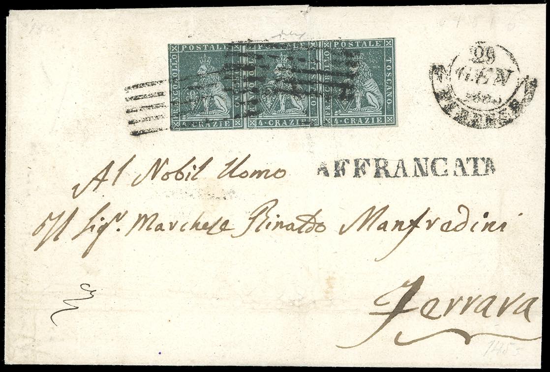 1855 - 4 crazie verde azzurro su grigio (6c), striscia orizzontale di tre, leggermente corta in alto, su lettera da Firenze 29/1/1855 a Ferrara. Chiavarello. Ex coll. Imperato.