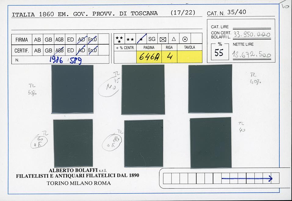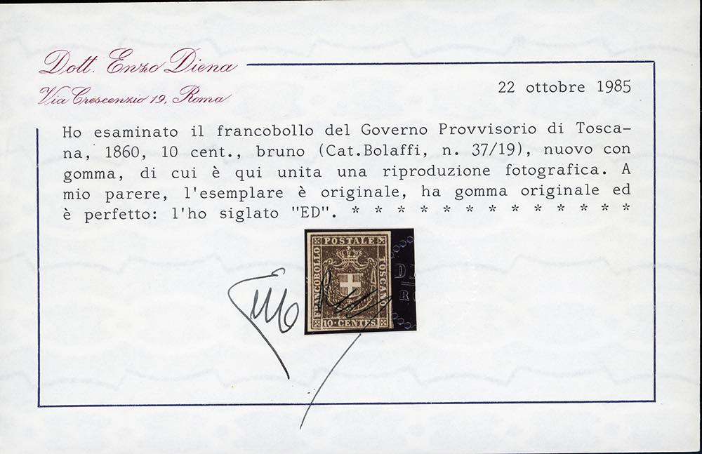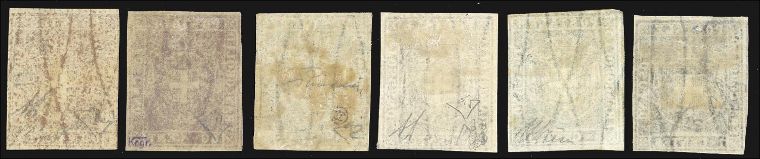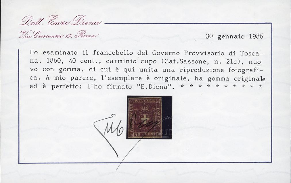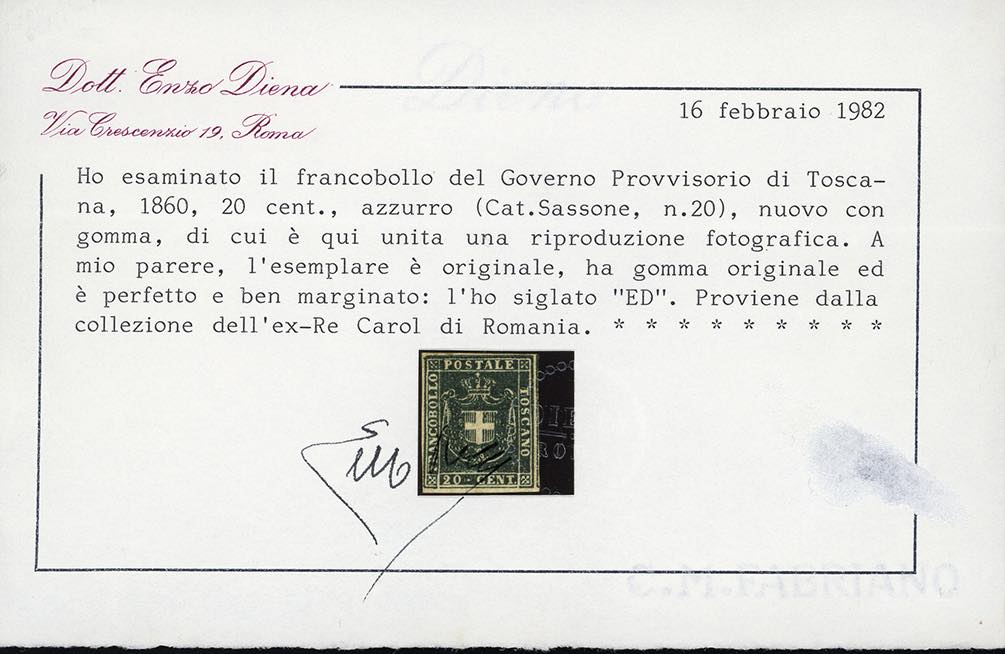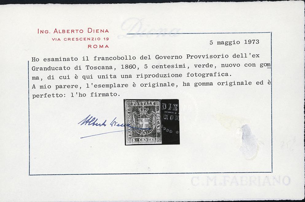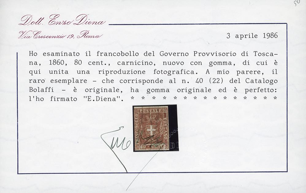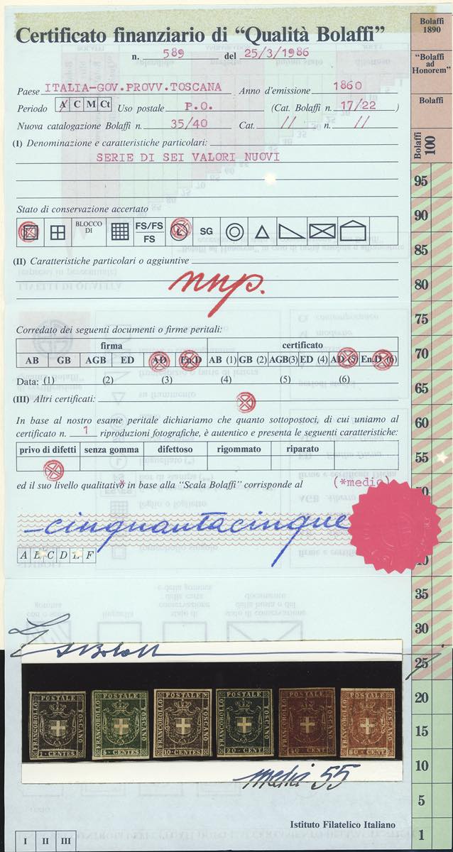1860 - Serie completa fino all'80 cent. (17/22), nuovi, gomma originale, perfetti. Insieme molto raro, specie in queste condizioni qualitative. Tutti firmati da noti periti, i valori da 5 cent. a 80 cent. con cert. Alberto o Enzo Diena, cert. finanziario Bolaffi per la serie. Il valore da 20 cent. (ampi margini) proviene dalla collezione Re Carol di Romania.