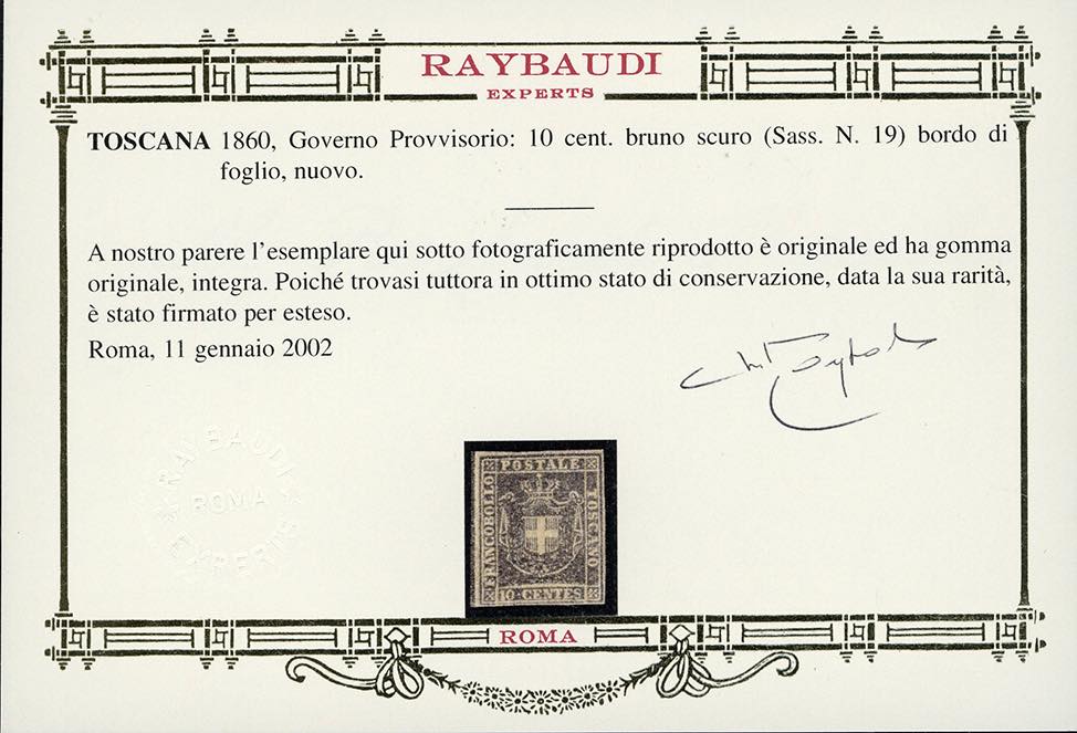 1860 - 10 cent. bruno, linea di riquadro verticale nel margine di foglio di sinistra (19g), nuovo, gomma originale integra, perfetto. Cert. ... Leggi tutto