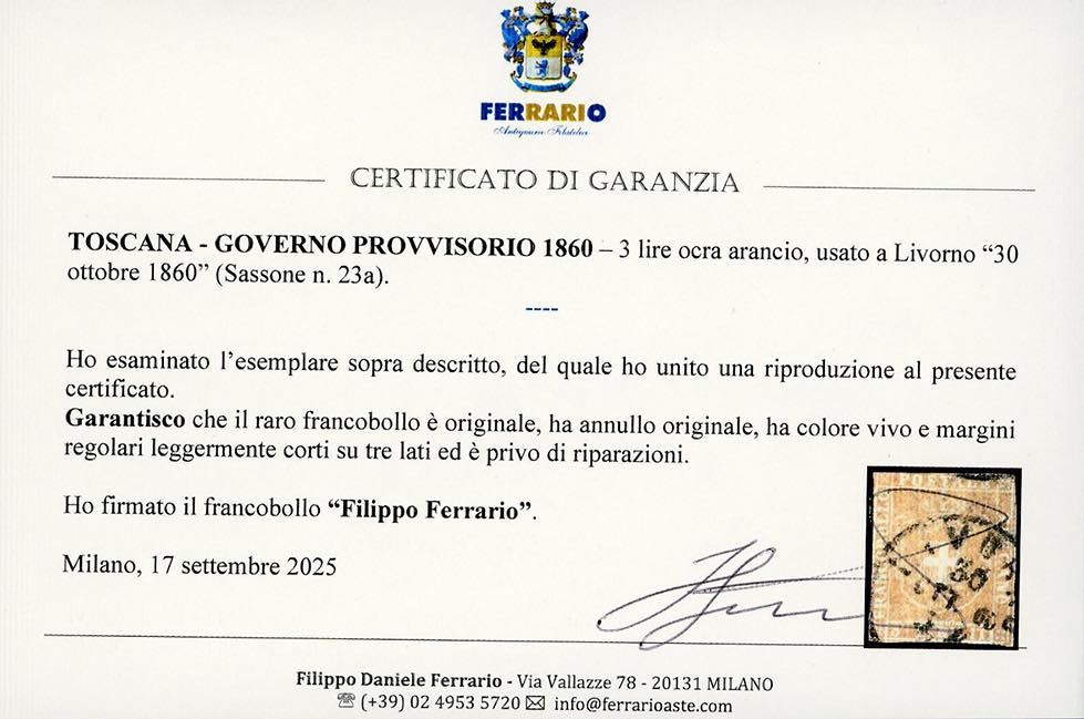 Lotto 716 - 1860 - 3 lire ocra arancio (23a), usato a Livorno 30 ...