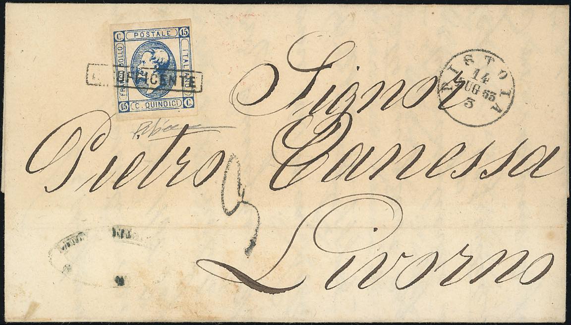 PISTOIA, insufficiente in cartella punti 12 - 15 cent. Litografico, II tipo (Regno 13), perfetto, su lettera del 14/7/1863 a Livorno, tassata 3. Molto rara! R.Diena.