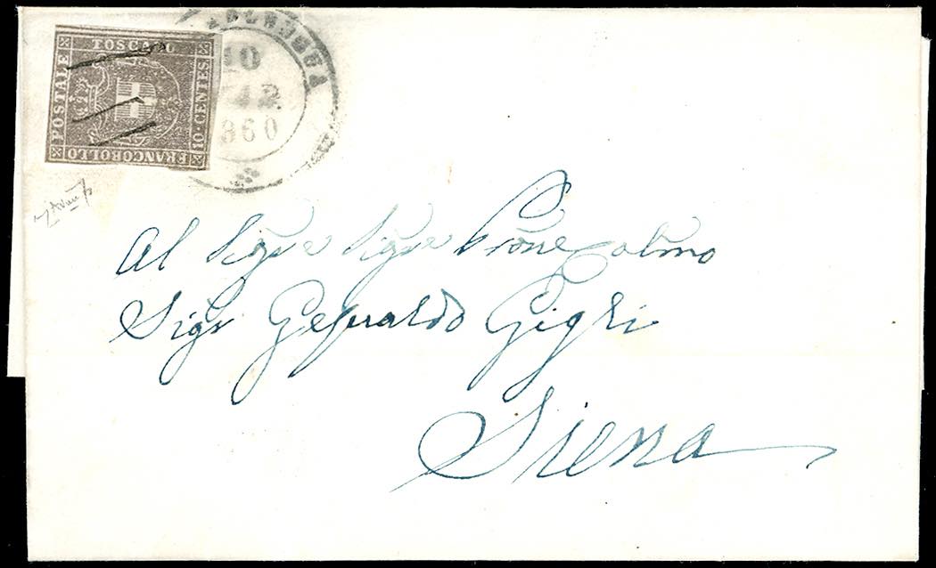 ROCCALBEGNA, doppio cerchio grande + penna coannullatori punti 13 - 10 cent. (19c), due margini intaccati, su sovracoperta di lettera del 10/3/1860 per Siena. Rara combinazione di annulli, unica! Cert. Avanzo.