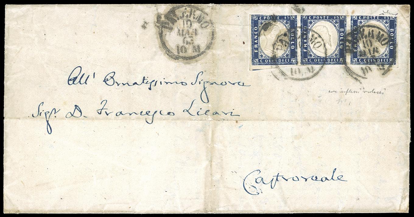 1863 - 15 cent. indaco con riflessi violacei (11g), striscia di tre, corta in alto, su lettera da Palermo 10/3/1863 a Castroreale. Rarissime le strisce di questa tinta su lettera. Ex coll. Imperato.