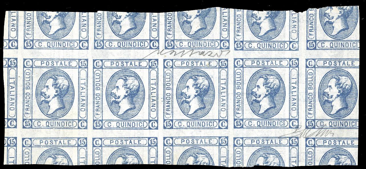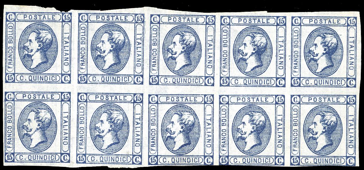 1863 - 15 cent. Litografico, I tipo (12), prova di macchina con stampa recto-verso disallineata, blocco di dieci esemplari, nuovo, senza ... Leggi tutto