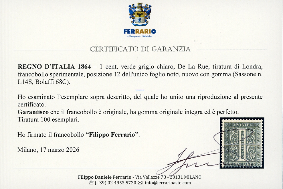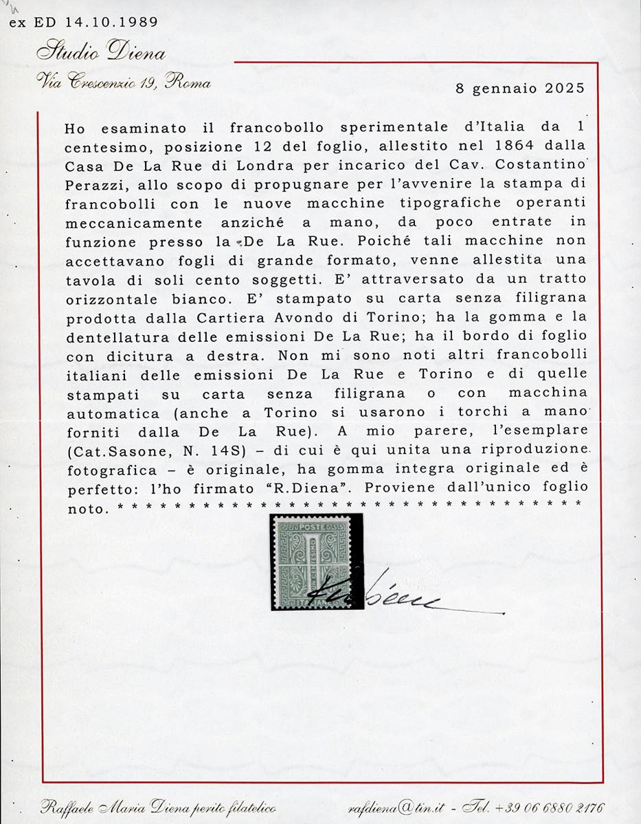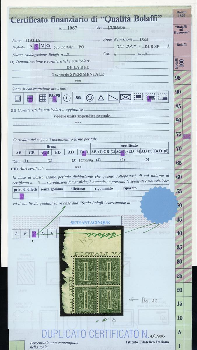 1864 - 1 cent. verde grigio chiaro De La Rue, FRANCOBOLLO SPERIMENTALE con tratto bianco orizzontale al centro, tiratura di Londra (Sass. L14S, Bolaffi 68C), posizione 12 dell'unico foglio noto, nuovo, originale integra, perfetto. Molto fresco e raro. Cert. Ferrario, Diena e finanziario Bolaffi del blocco di quattro 75%.