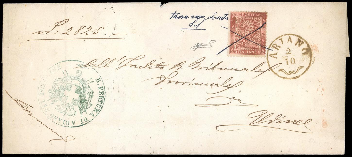 1868 - 2 cent. De La Rue, tiratura di Torino (T15), perfetto, su lettera da Ariano 2/10/1868 ad Udine. La lettera godeva di franchigia, per cui il francobollo non venne obliterato ma solo annullato con tratti incrociati di penna, scrivendo a fianco "tassa non dovuta". Interessante e rara. Ferrario.