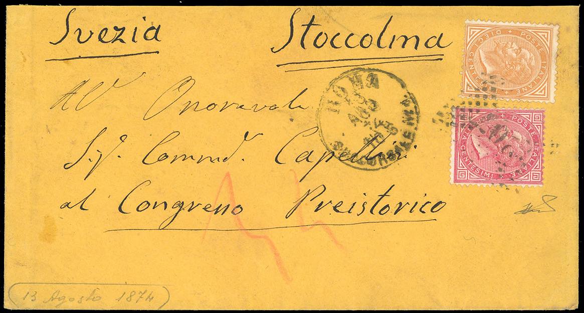 1874 - 10 cent. e 40 cent. De La Rue, tiratura di Torino (T17,T20), perfetti, su busta da Roma 13/8/1874 a Stoccolma in Svezia. Pregevole ... Leggi tutto
