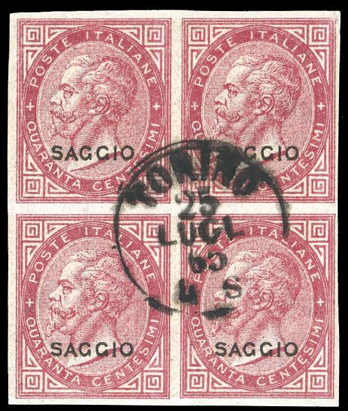 1863 - 40 cent. De La Rue (L20), soprastampato saggio, non dentellato, blocco di quattro con annullo sperimentale Torino 25/7/1865, ... Leggi tutto