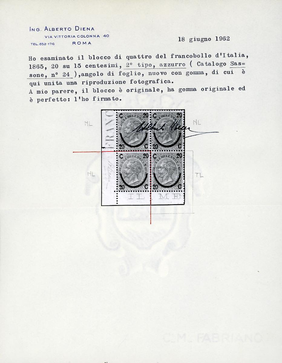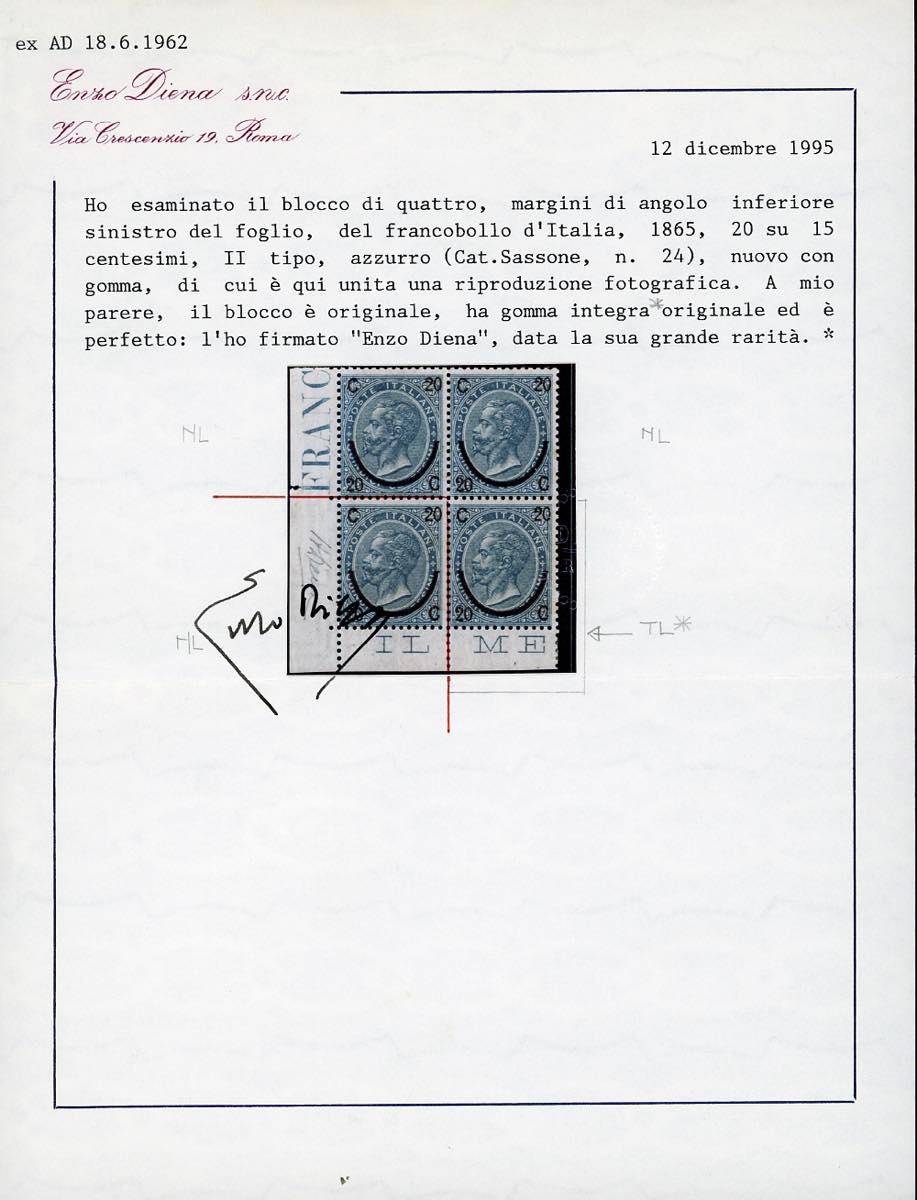 1865 - 20 cent. su 15 cent. Ferro di cavallo, II tipo (24), angolo di foglio, nuovo, gomma originale integra, perfetto. Molto raro, Cert. finanziario Bolaffi 75%, cert. Enzo Diena e fotocopia cert. Alberto Diena del blocco di quattro di provenienza.
