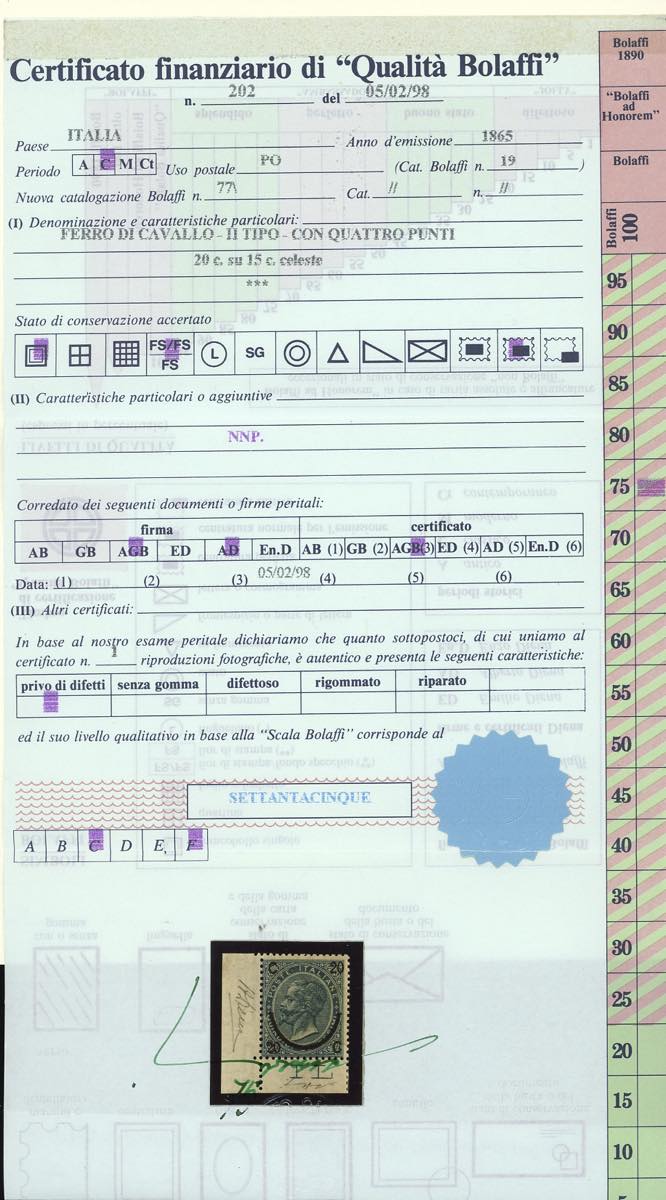 Lotto 802 - 1865 - 20 cent. su 15 cent. Ferro di cavallo, II tipo (24), ...