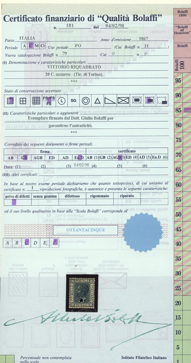 1867 - 20 cent. azzurro, tiratura di Torino (T26), ottima centratura, nuovo, gomma originale integra, perfetto e di ottima qualità. Molto bello. G.Bolaffi, E.Diena, cert. finanziario Bolaffi 85%.
