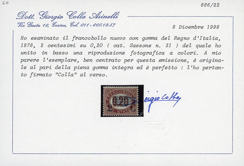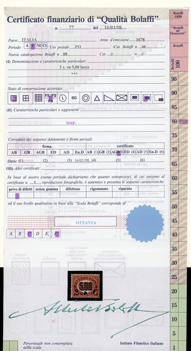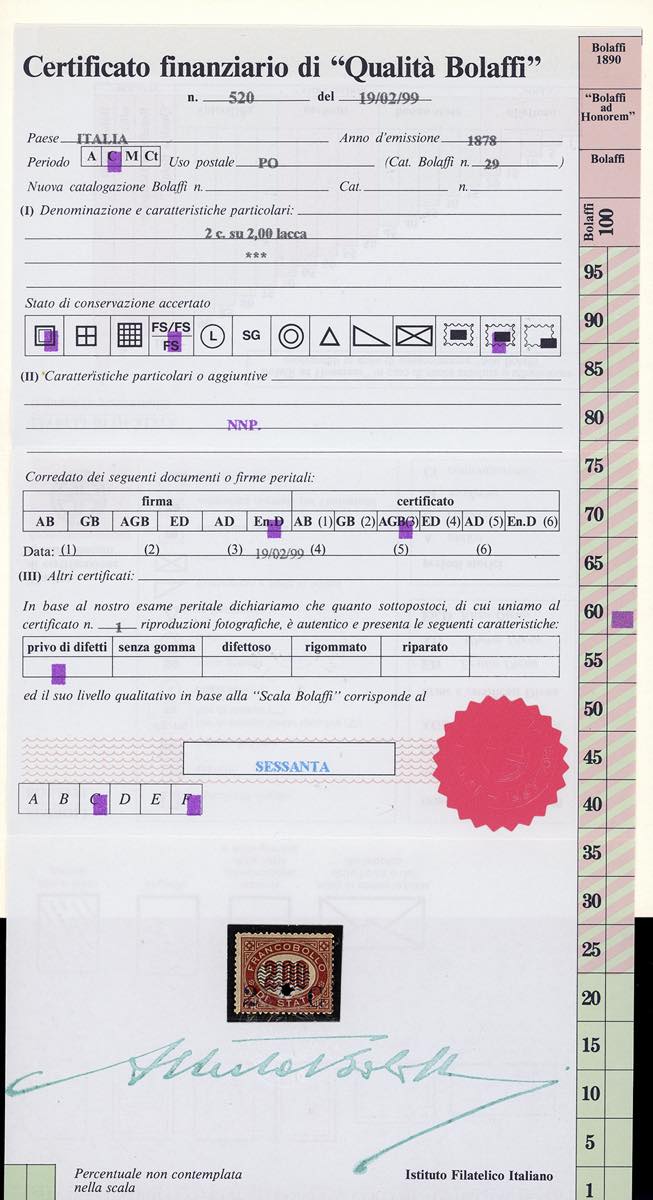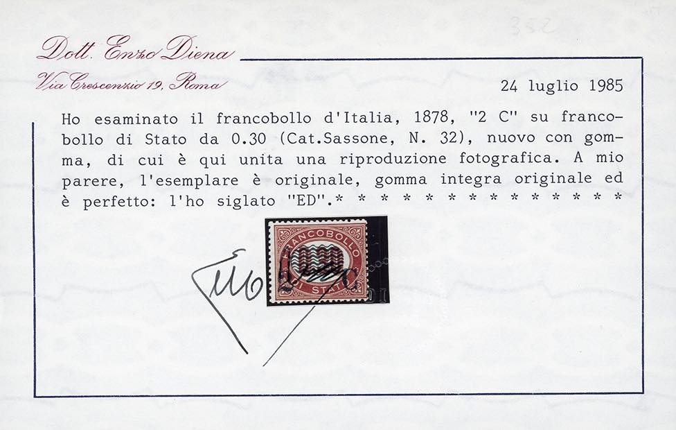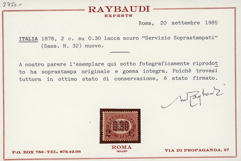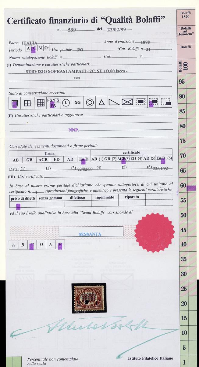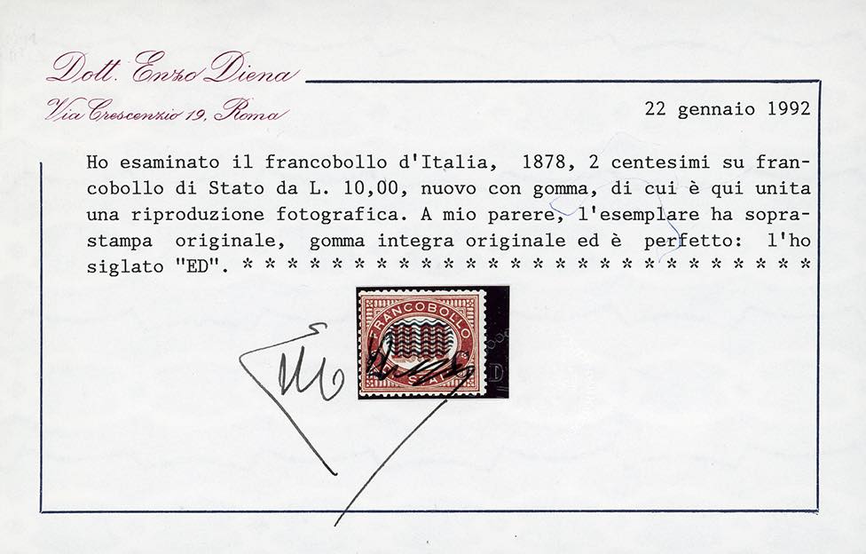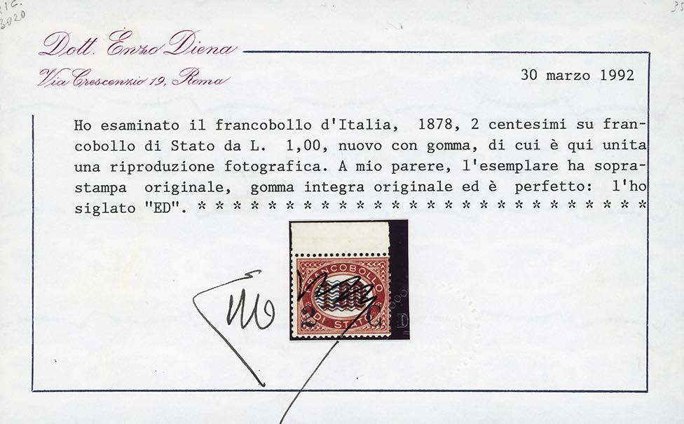 1878 - Servizio soprastampati, serie completa (29/36), tre esemplari ben centrati, nuovi, gomma originale integra, perfetti. Tutti firmati o certificati da noti periti, i tre alti valori cert. finanziario Bolaffi.