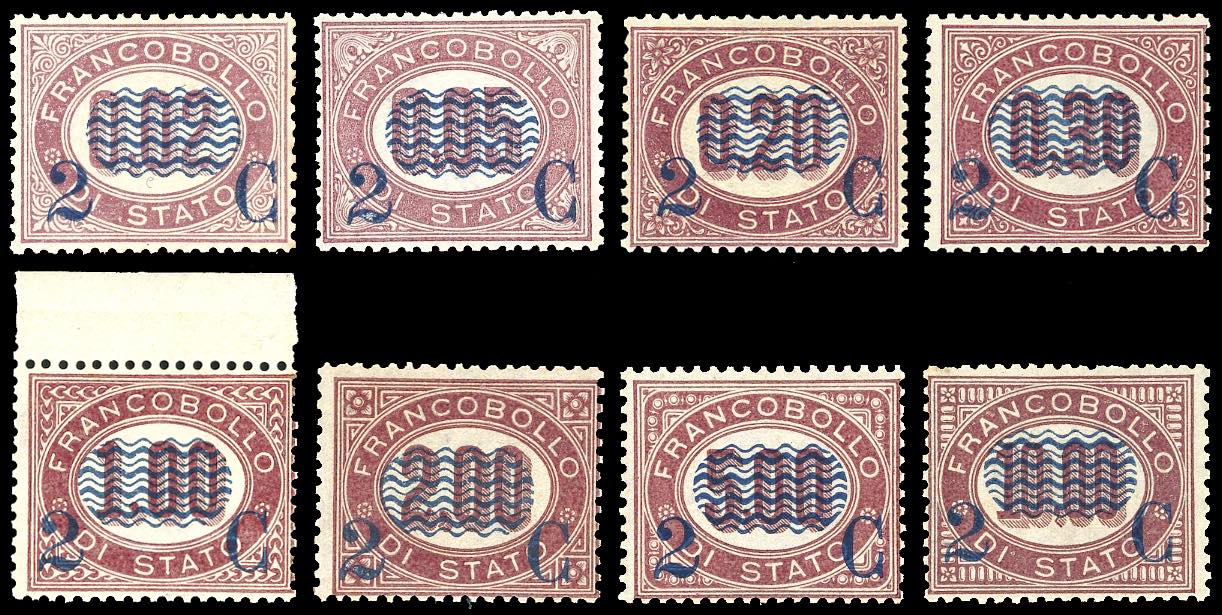 1878 - Servizio soprastampati, serie completa (29/36), tre esemplari ben centrati, nuovi, gomma originale integra, perfetti. Tutti firmati ... Leggi tutto