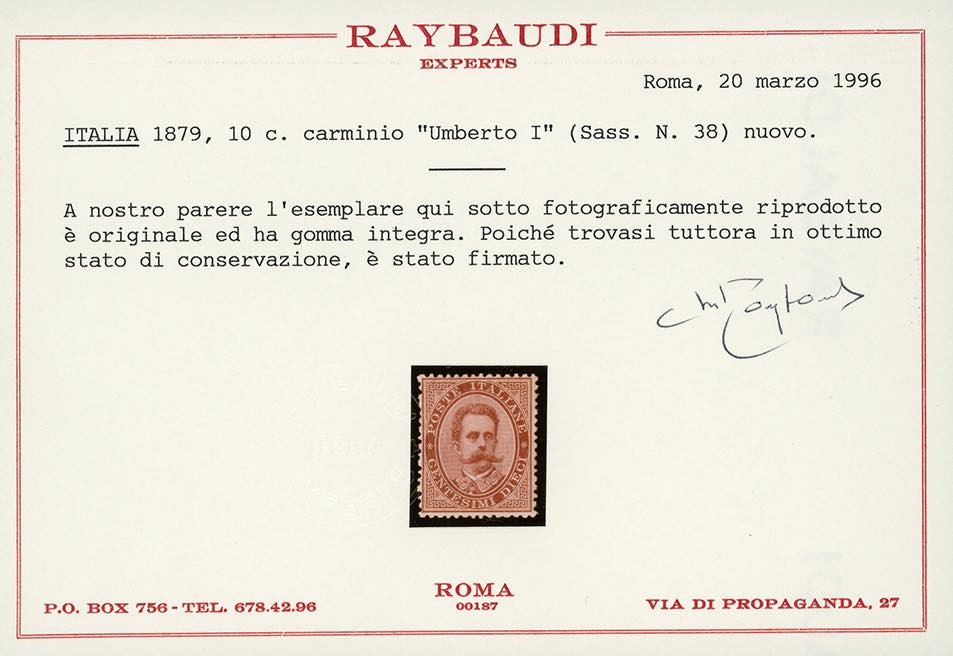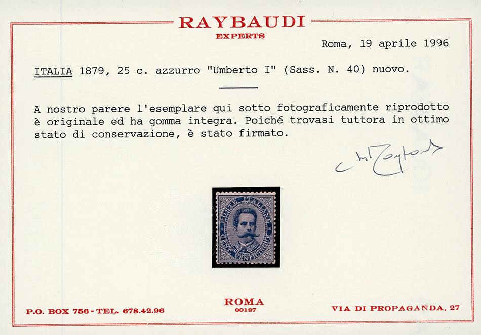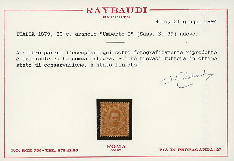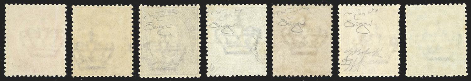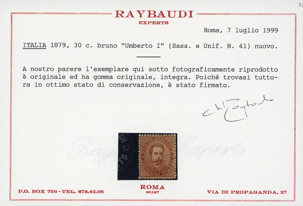 1879 - Umberto I, serie completa (37/43), ottima centratura, nuovi, gomma originale integra, perfetti e di ottima qualità. Splendidi. I quattro alti valori con quattro cert. Raybaudi ed unico cert. Oro Raybaudi.