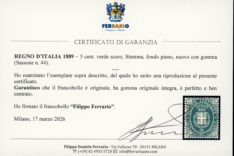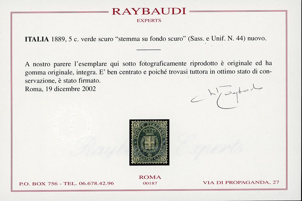 1889 - 5 cent. verde scuro, Stemma, fondo pieno (44), nuovo, gomma originale integra, perfetto e ben centrato. Molto fresco. Cert. Ferrario e Raybaudi.