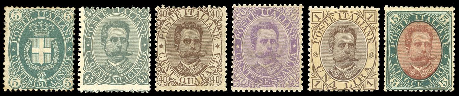 1889 - L'emissione completa (44/49), nuovi, gomma originale, leggera traccia di linguella, perfetti. Il 5 cent. con due puntini di ossidazione. Il 45 cent. Cert. A.Diena.