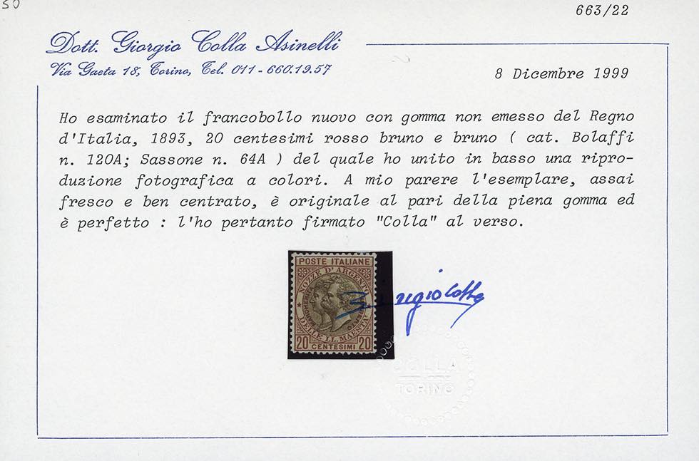 1893 - 20 cent. rosso bruno e bruno Nozze d'argento, non emesso (64A), ottima centratura, nuovo, gomma originale, leggera traccia di ... Leggi tutto