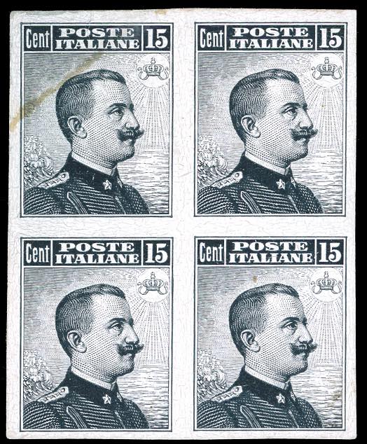 1911 - 15 cent. Michetti, III tipo (96), prova per libretto su carta spessa, non dentellata, blocco di quattro, senza gomma come sempre, ... Leggi tutto
