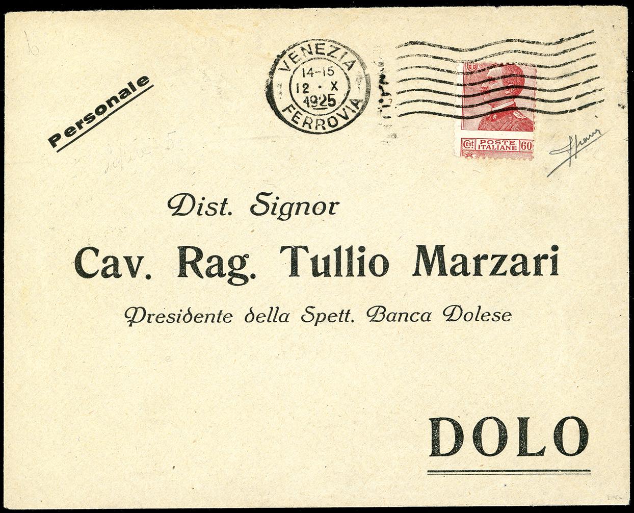 1925 - 60 cent. Michetti, dentellatura orizzontale fortemente spostata (111k), perfetto, usato su busta da Venezia 12/10/1925 a Dolo. Raro ... Leggi tutto