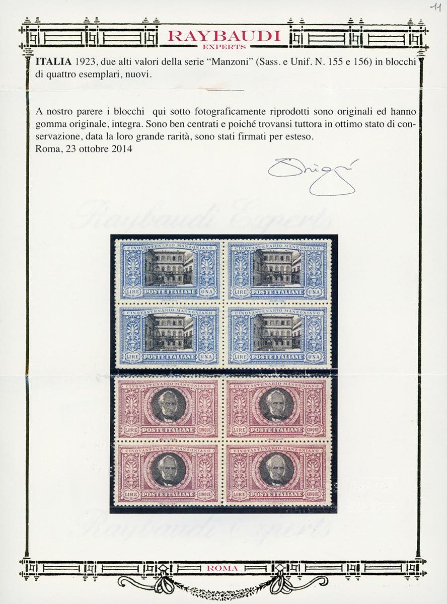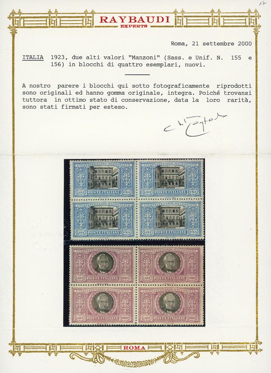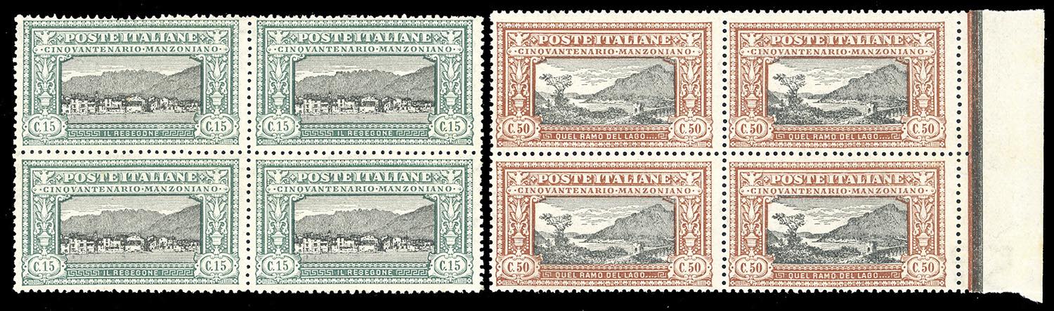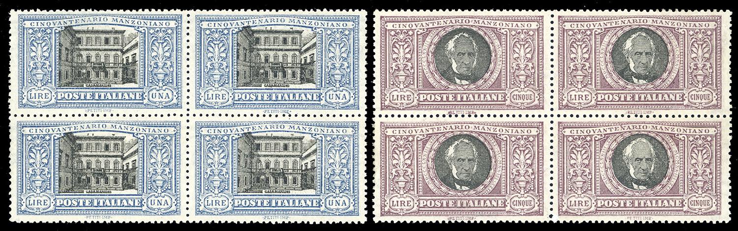 1923 - Manzoni, serie completa (151/156), ben centrati, blocchi quattro, gomma originale integra, perfetti e molto freschi. G.Oliva per il 5 lire, due cert. Oro Raybaudi per i due valori.