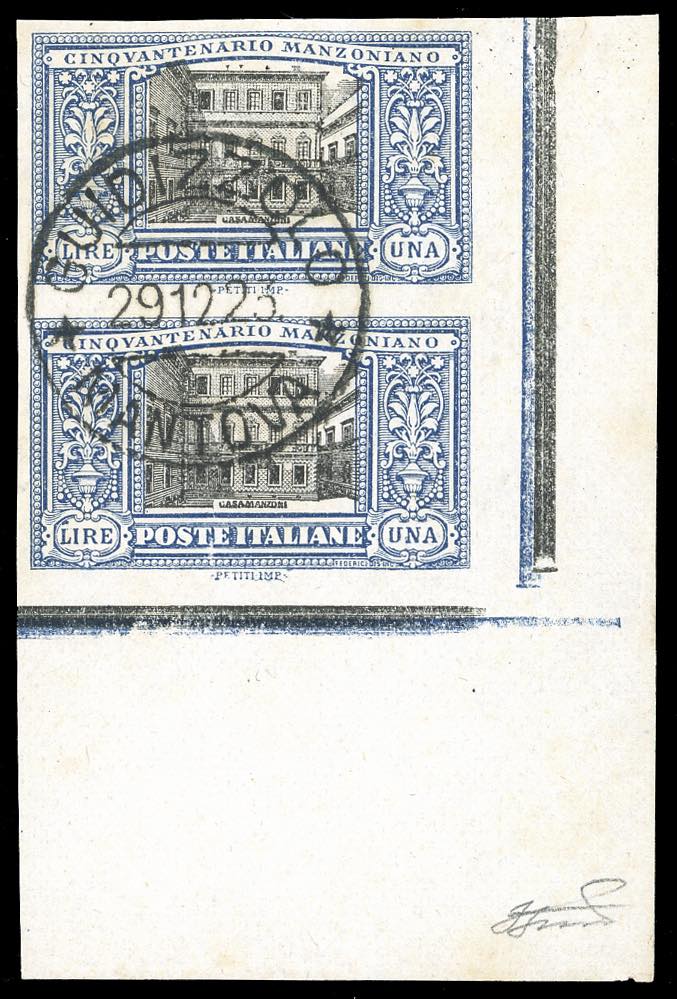 1923 - 1 lira Manzoni, non dentellato (155d), coppia verticale, angolo di foglio, perfetta, usata a Guidizzolo 29/12/1923, primo giorno d'emissione. Splendida. E.Diena, cert. Ferrario.