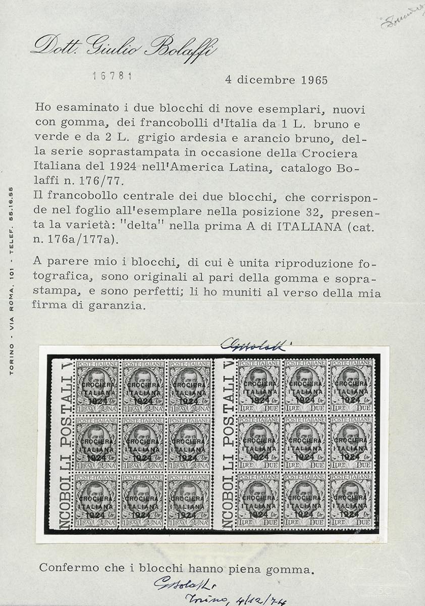 1924 - Crociera Italiana, serie completa, blocchi di nove con al centro l'esemplare con varietà "delta" al posto della "A", posiz. 32 (162/168,162e/168e), ben centrati, bordo di foglio, nuovi, gomma originale integra, perfetti. Splendidi e molto rari, pochi blocchi noti! A.Diena, cert. G.Bolaffi per i due alti valori.
