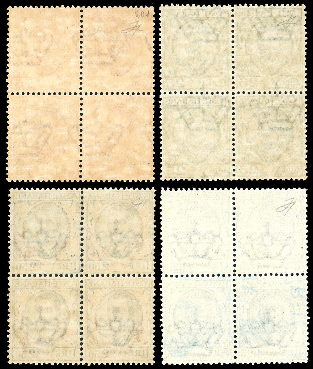 1926 - 25 cent., 75 cent, 1,25 e 2,50 lire Floreale, serie completa (200/203), blocchi di quattro, ben centrati, gomma originale integra, ... Leggi tutto
