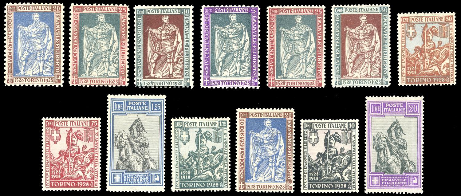 1928 - Emanuele Filiberto, serie completa (226/238), ottima centratura, nuovi, gomma originale integra, perfetti. Molto belli. Alti valori Ferrario.