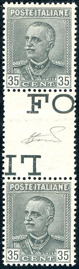 1929 - 35 cent. Vittorio Emanuele III (241), coppia verticale con interspazio di gruppo al centro, nuova, gomma originale integra, perfetta. Splendida e rara. Non catalogata. Ferrario.