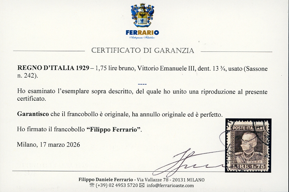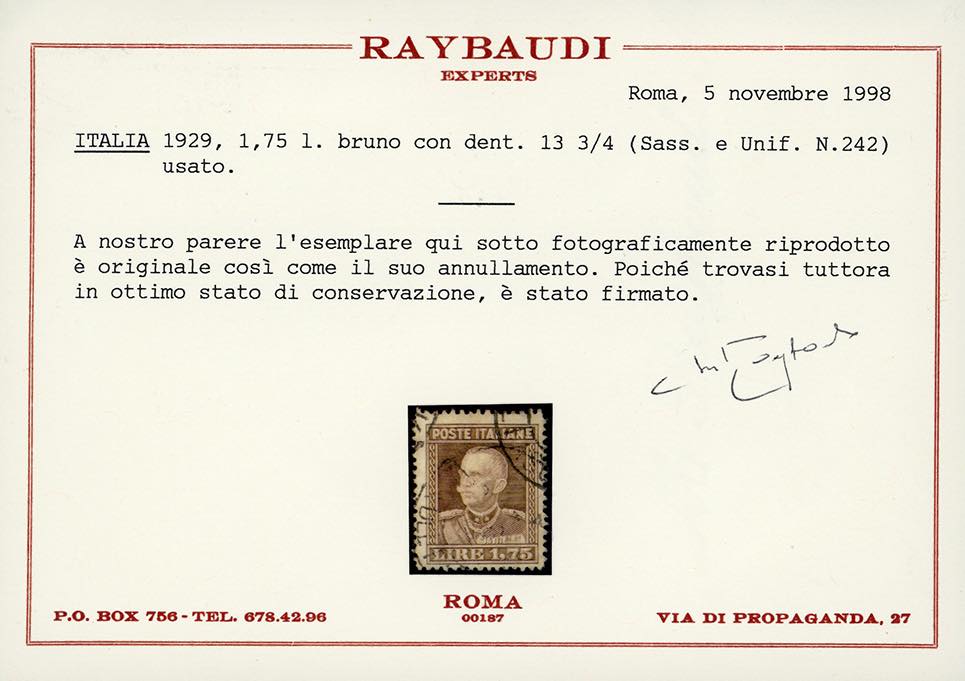 1929 - 1,75 lire bruno Vittorio Emanuele III, dent. 13 3/4 (242), usato, perfetto. A.Diena, cert. Raybaudi e Ferrario.