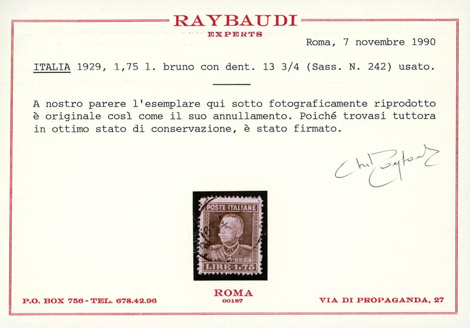 1929 - 1,75 lire bruno Vittorio Emanuele III, dent. 13 3/4 (242), usato, perfetto. Cert. Raybaudi.