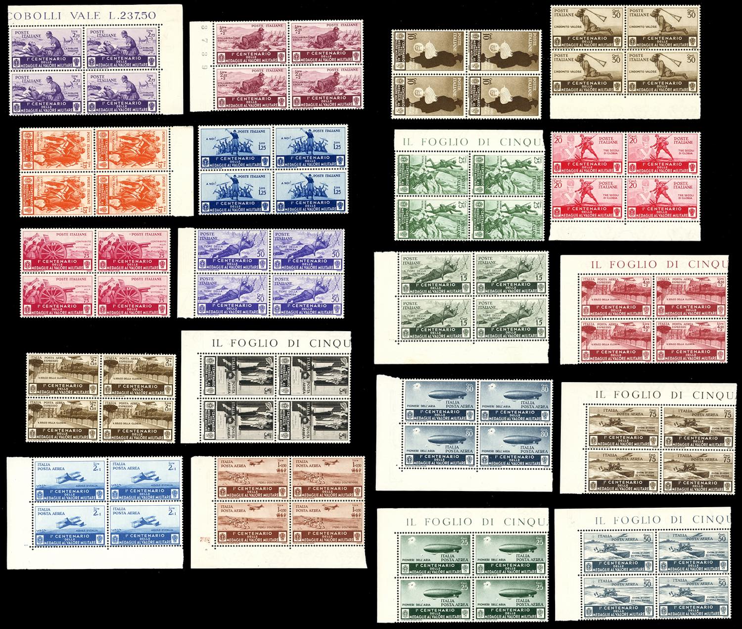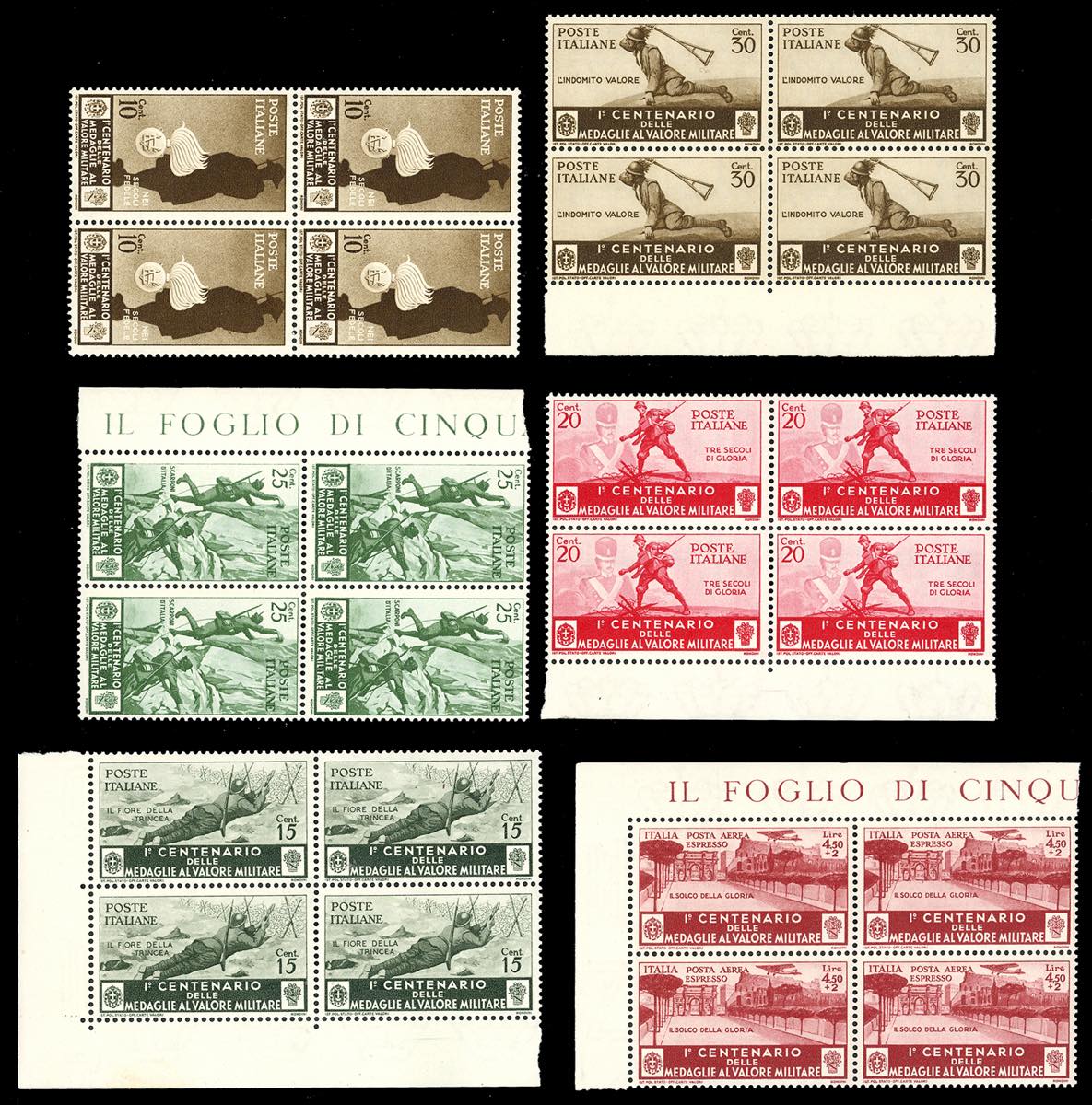 1934 - Medaglia al Valore, serie compelta (366/376+A), blocchi di quattro, diversi bordo/angolo di foglio, nuovi, gomma originale integra, perfetti. Cert. Diena per i n. 372/373.