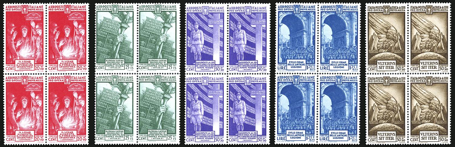 1935 - Milizia IV emissione, serie completa (380/383+A), blocchi di quattro, gomma originale integra, perfetti.