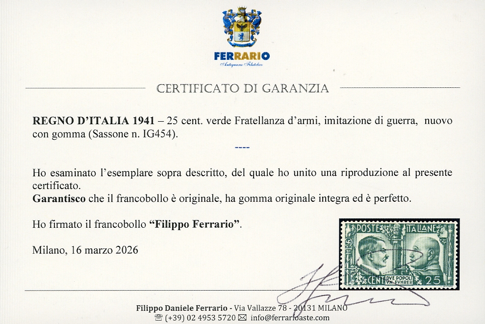 1941 - 25 cent. Fratellanza d'armi, imitazione di Guerra (IG454), nuovo, gomma originale integra, perfetto. Raro e di ottima qualità. Cert. Ferrario.