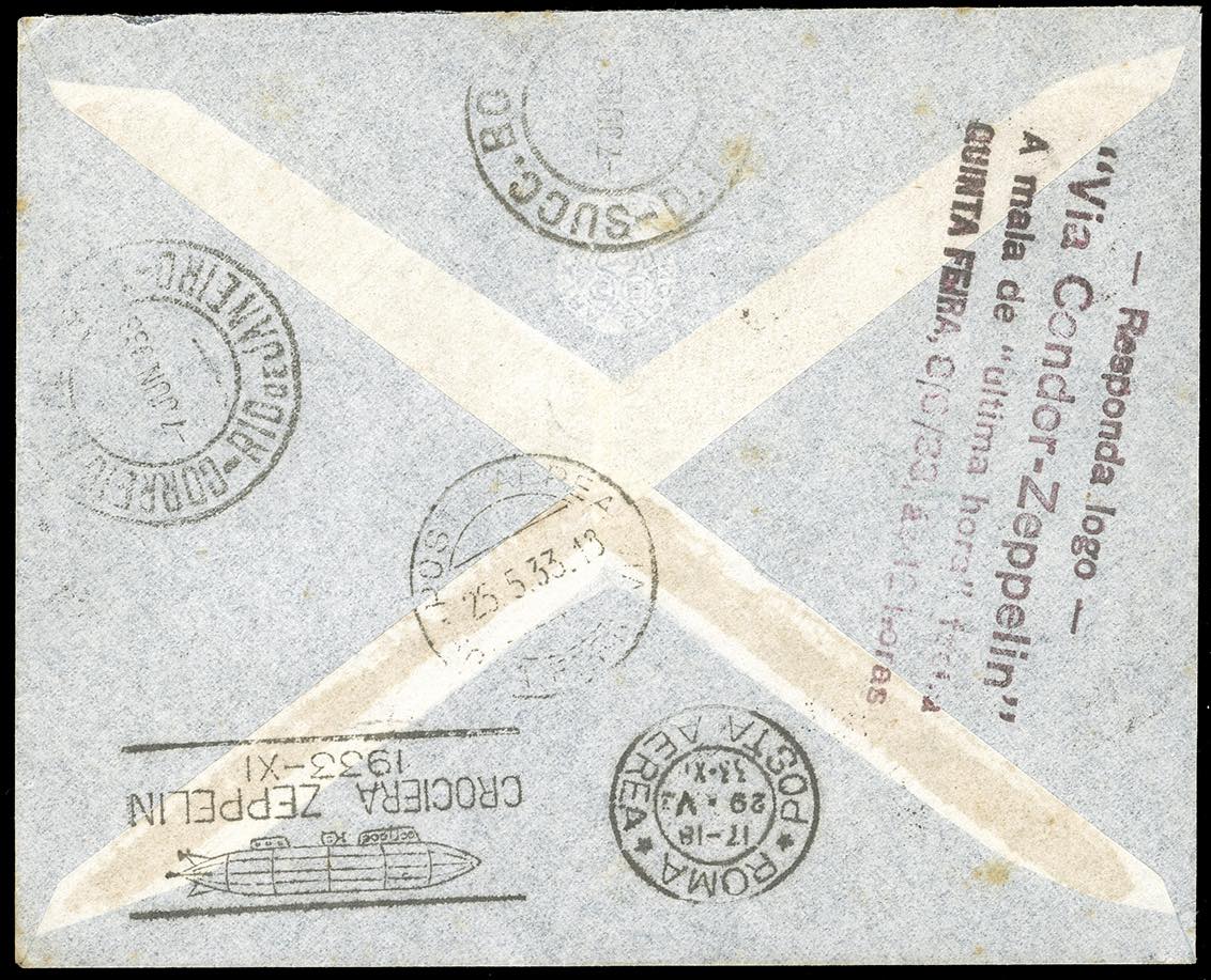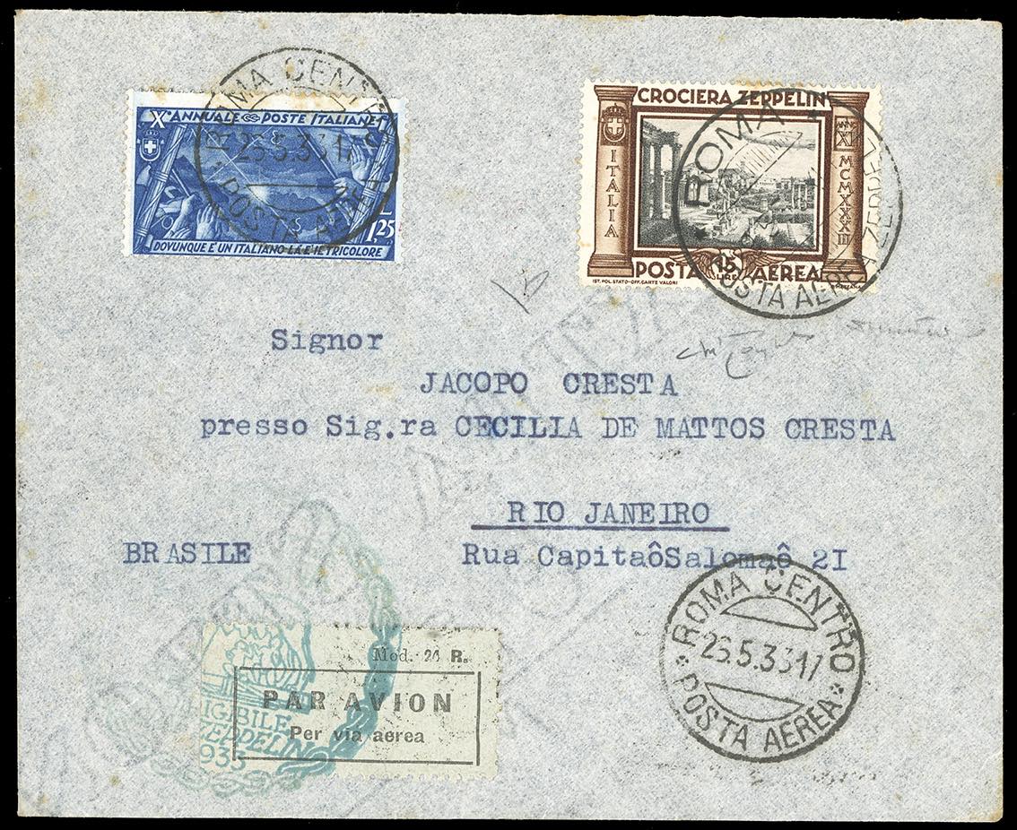 1933 - 15 lire Zeppelin, con complementare (A49,336), perfetti, su aerogramma da Roma 26/5/1933 per il Brasile, sul fronte e al verso voli speciali della Crociera Zeppelin. E.Diena, Raybaudi.