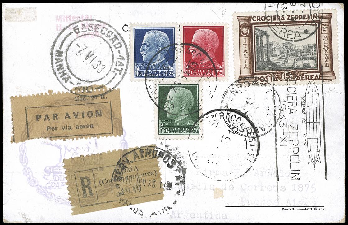 1933 - 15 lire Zeppelin, con complementari (A49,248,252,253), perfetti, su cartolina raccomandata per via aerea da Roma 29/5/1933 per l'Argentina, bolli speciali della Crociera Zeppelin. E.Diena, Chiavarello.