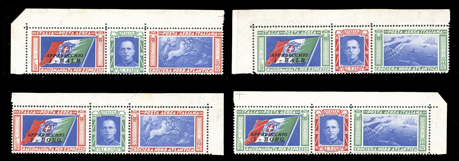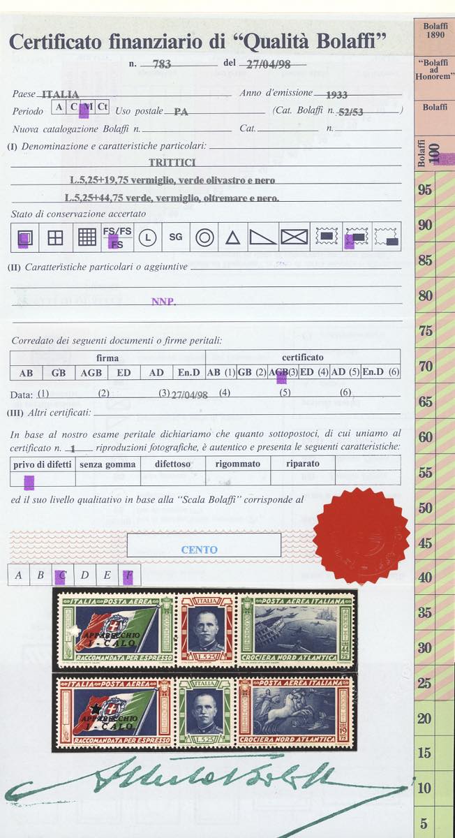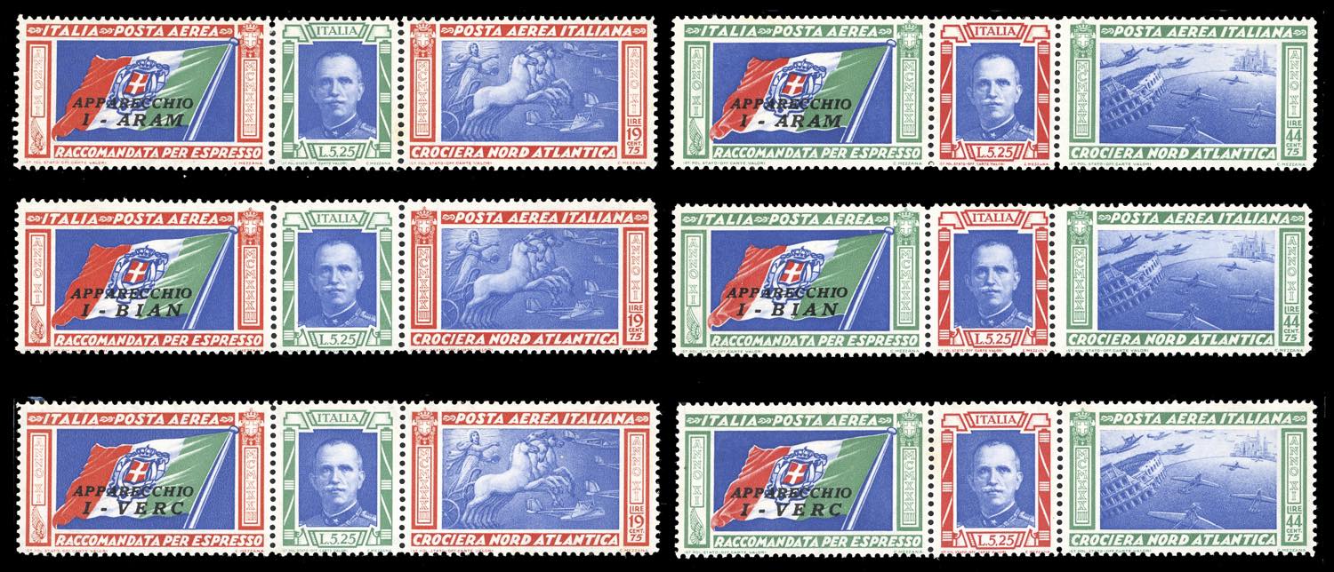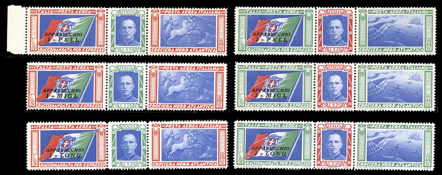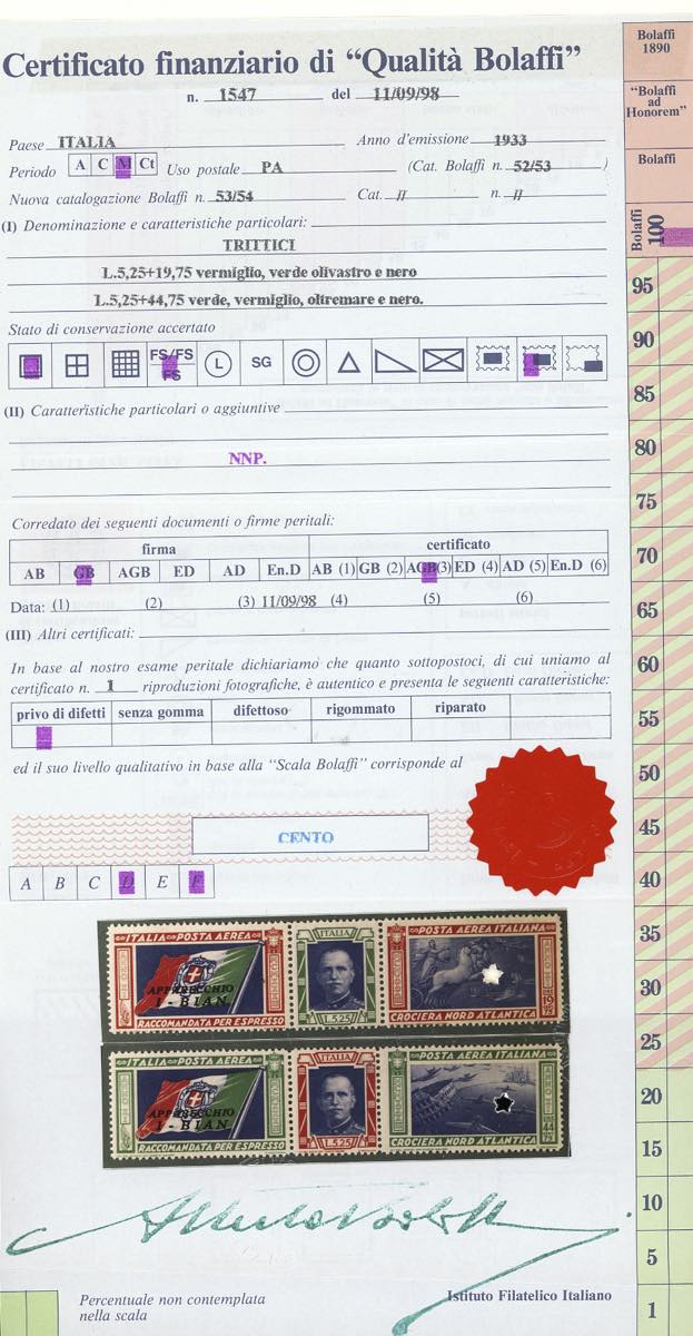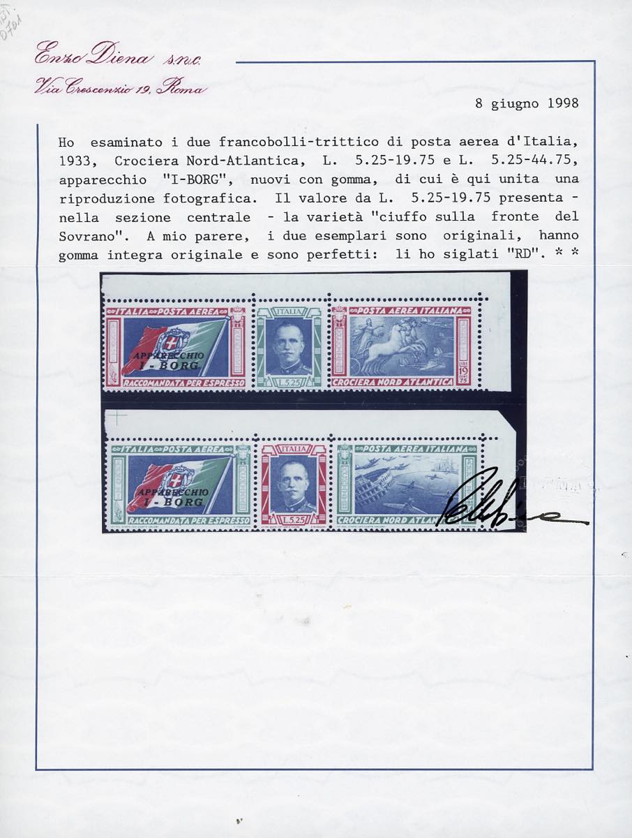 1933 - Trittici della Crociera Nord Atlantica, giro completo delle venti sigle diverse, comprendente il trittico I-BORG con "ciuffo" (51Da), nuovi, gomma originale integra, perfetti e di ottima qualità. Sei cert. Finanziari Bolaffi, cert. Diena per il ciuffo.