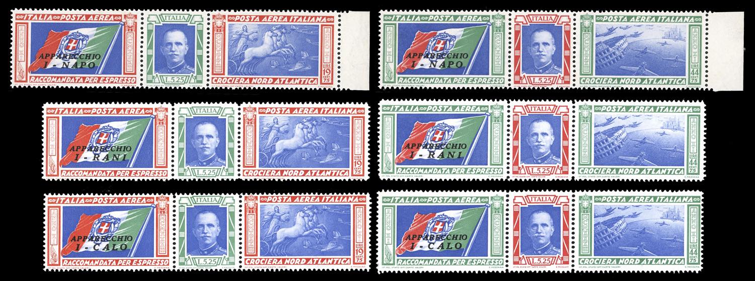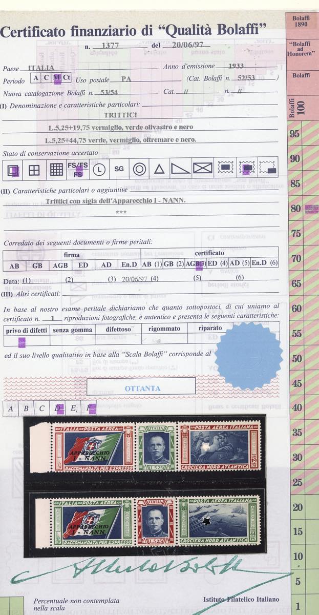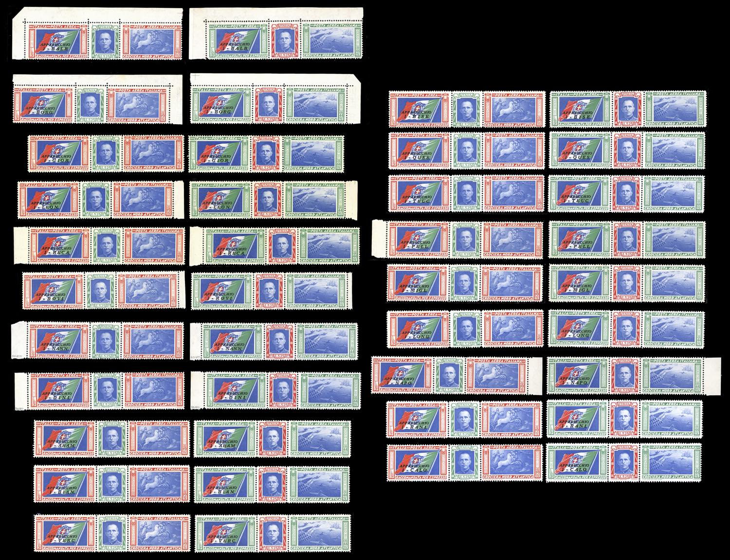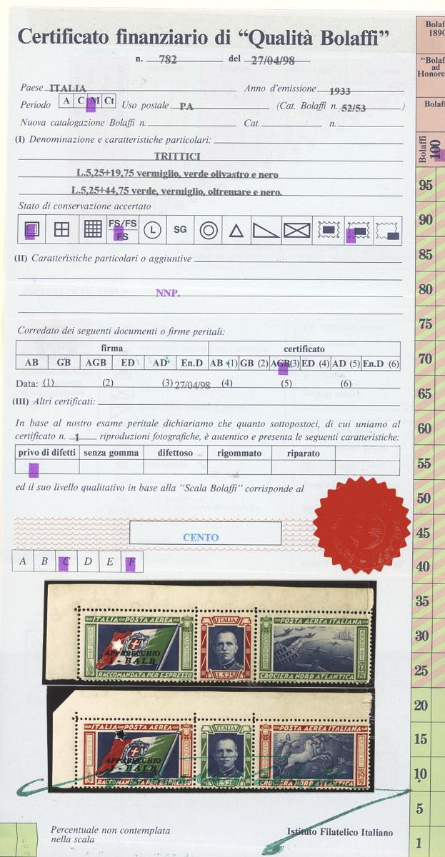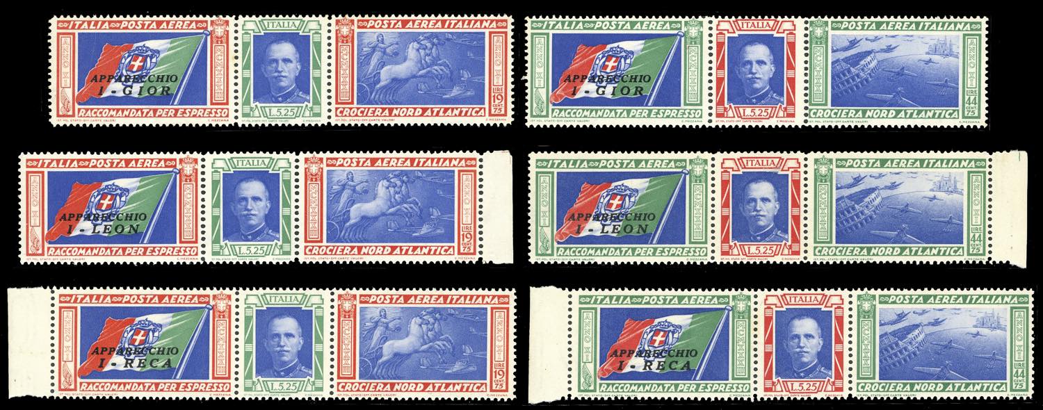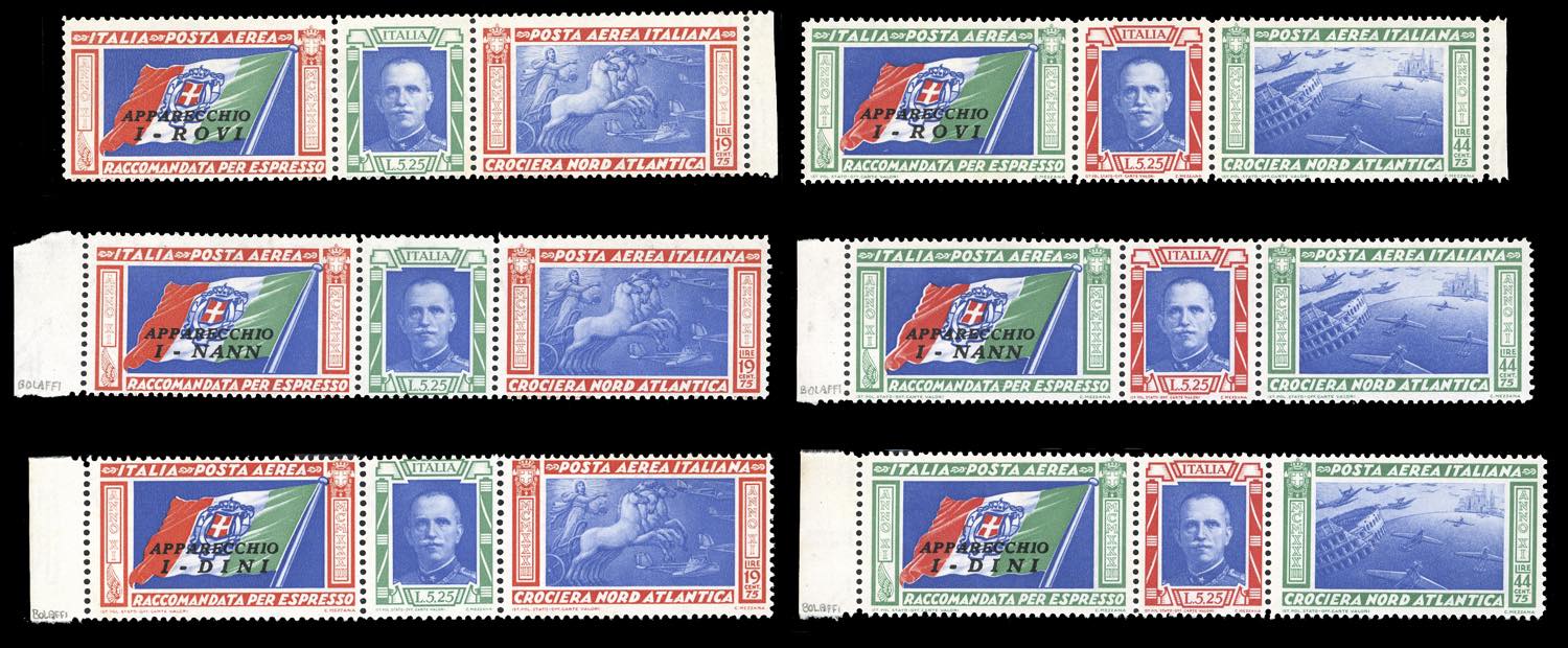 1933 - Trittici della Crociera Nord Atlantica, giro completo delle venti sigle diverse, comprendente il trittico I-BORG con "ciuffo" (51Da), nuovi, gomma originale integra, perfetti e di ottima qualità. Sei cert. Finanziari Bolaffi, cert. Diena per il ciuffo.